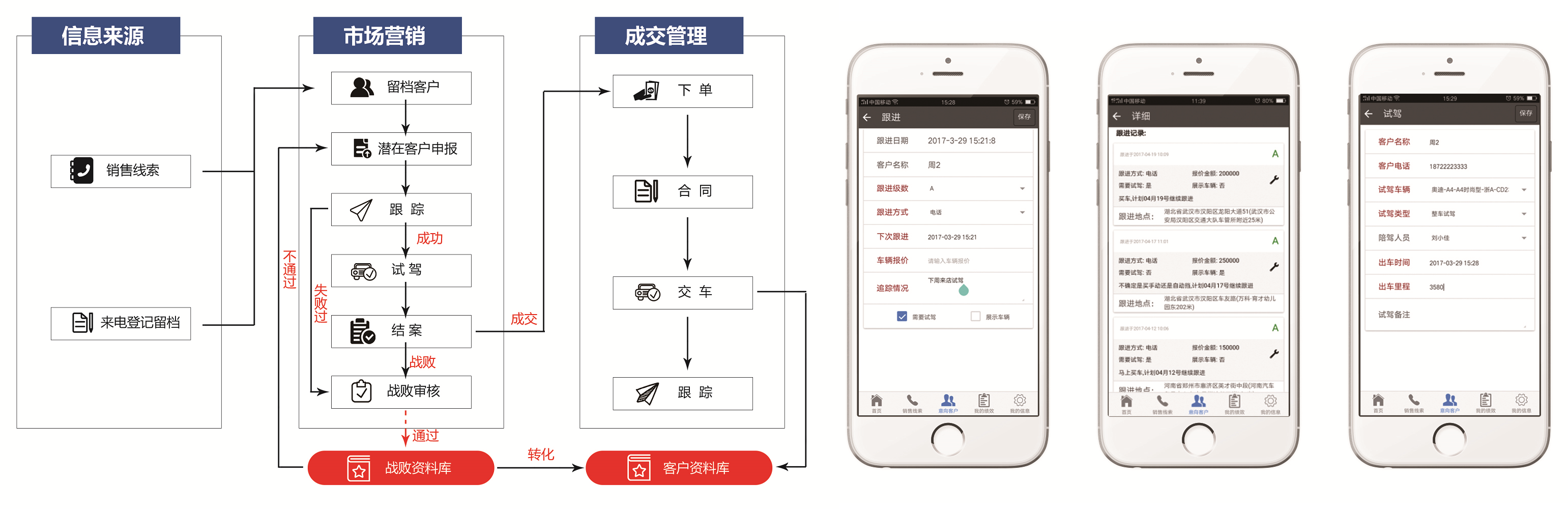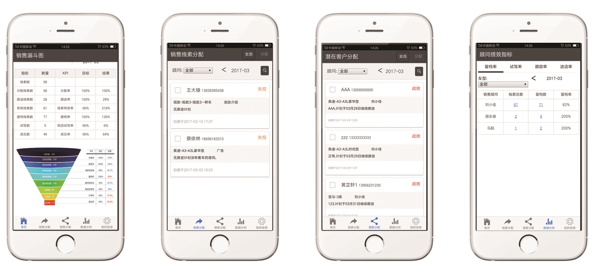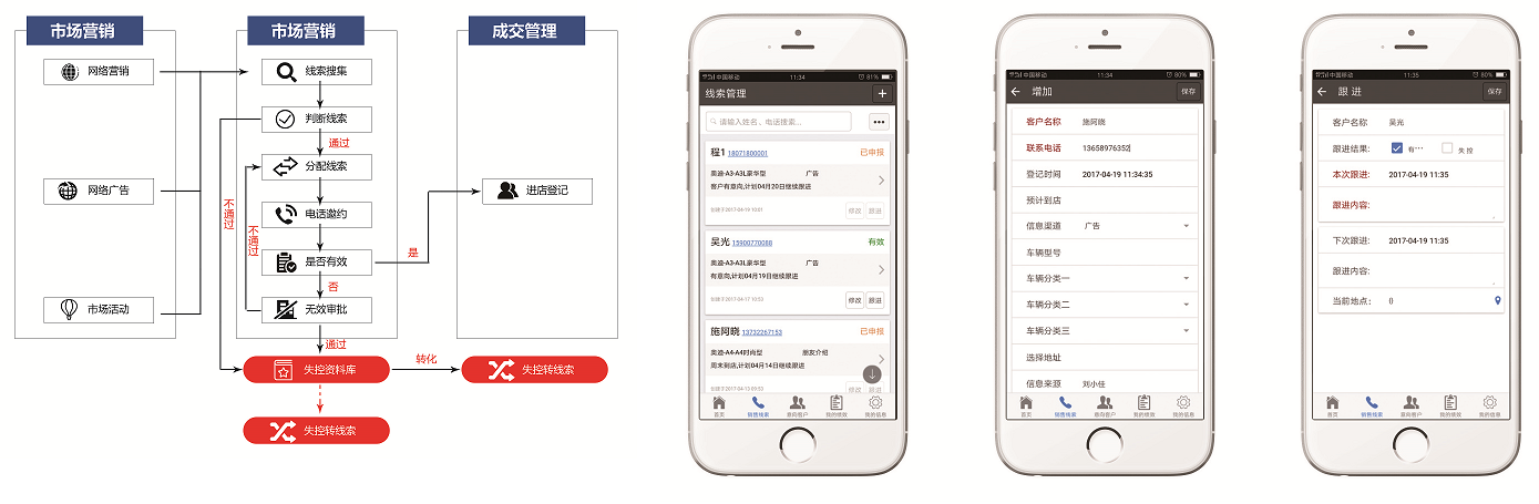 銷售管理人員不用再去問銷售顧問,每個(gè)顧客的成交進(jìn)度條,系統(tǒng)自動(dòng)生成,手機(jī)可以檢索顧客電話、哪個(gè)車型有多少潛客隨時(shí)查詢、成交后顧客的系統(tǒng)要求強(qiáng)制跟進(jìn);